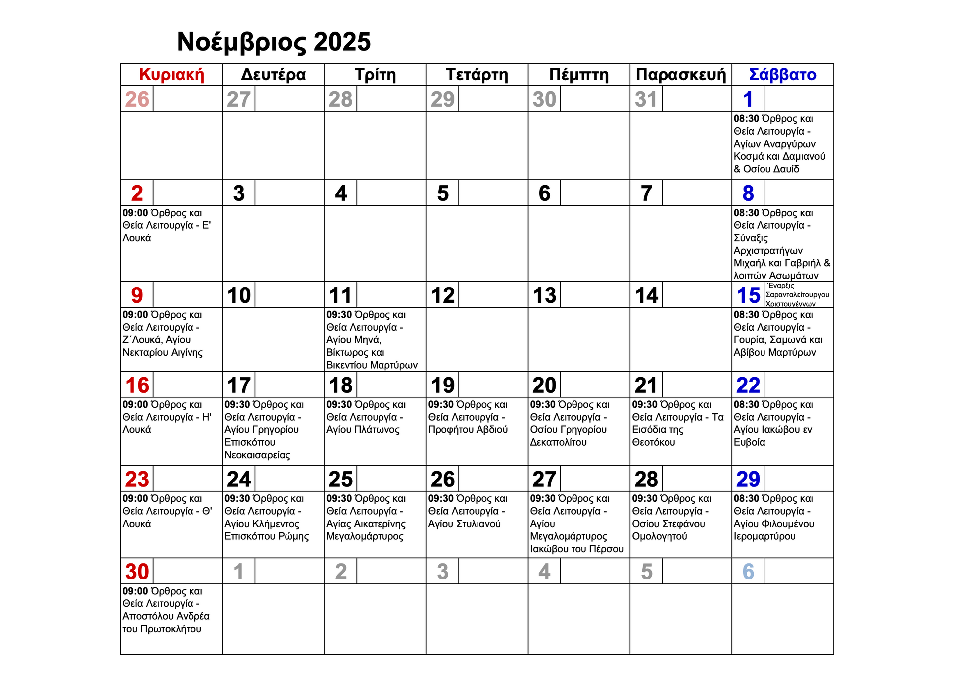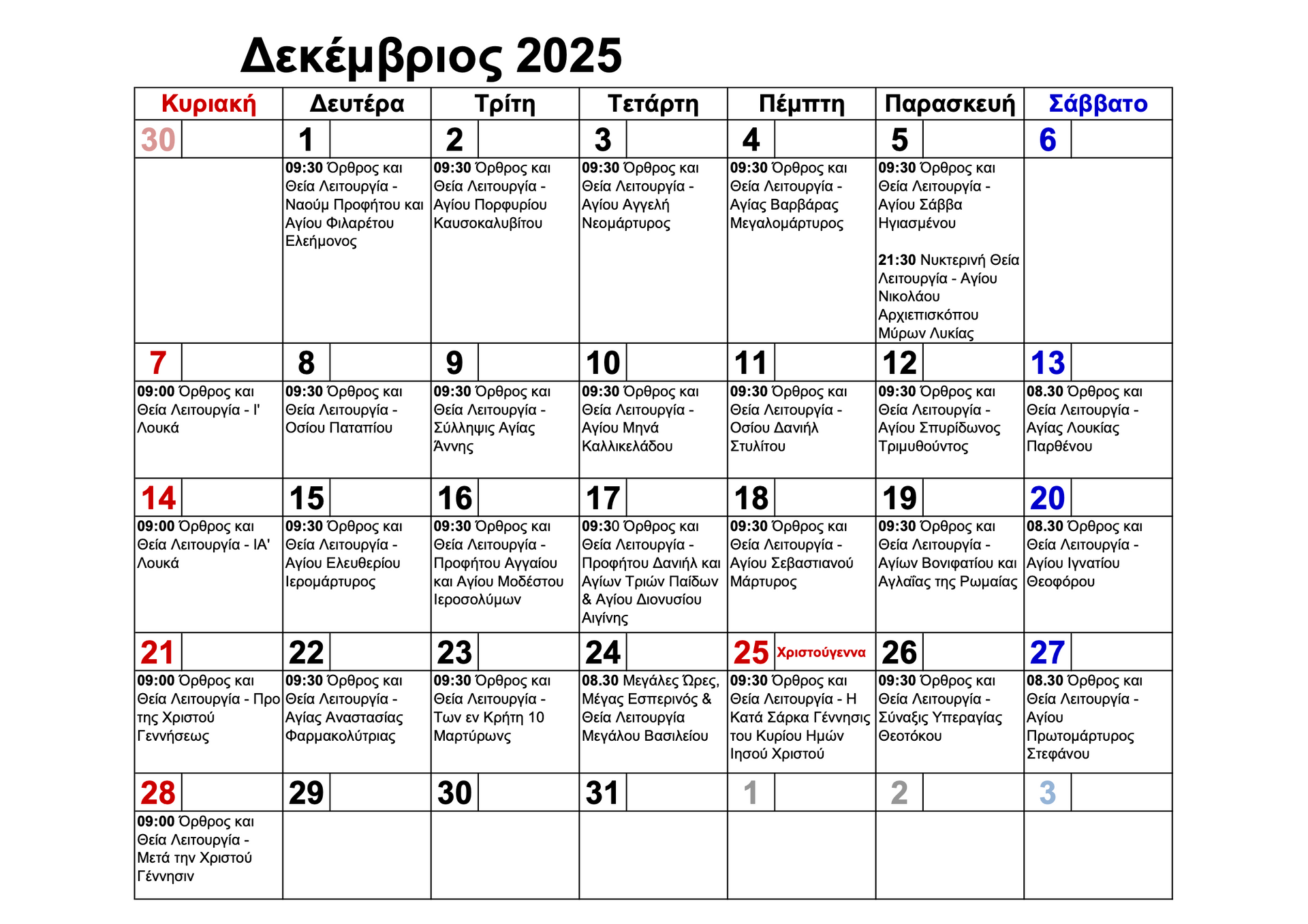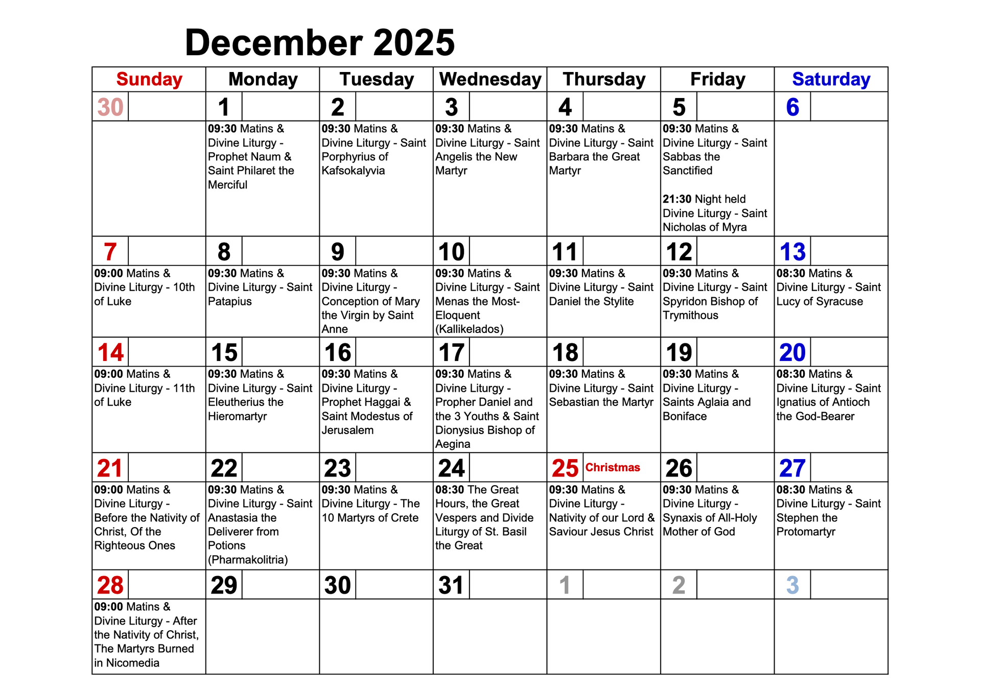 - Lord’s and Mother of God’s feasts 9:00am – 12:00m