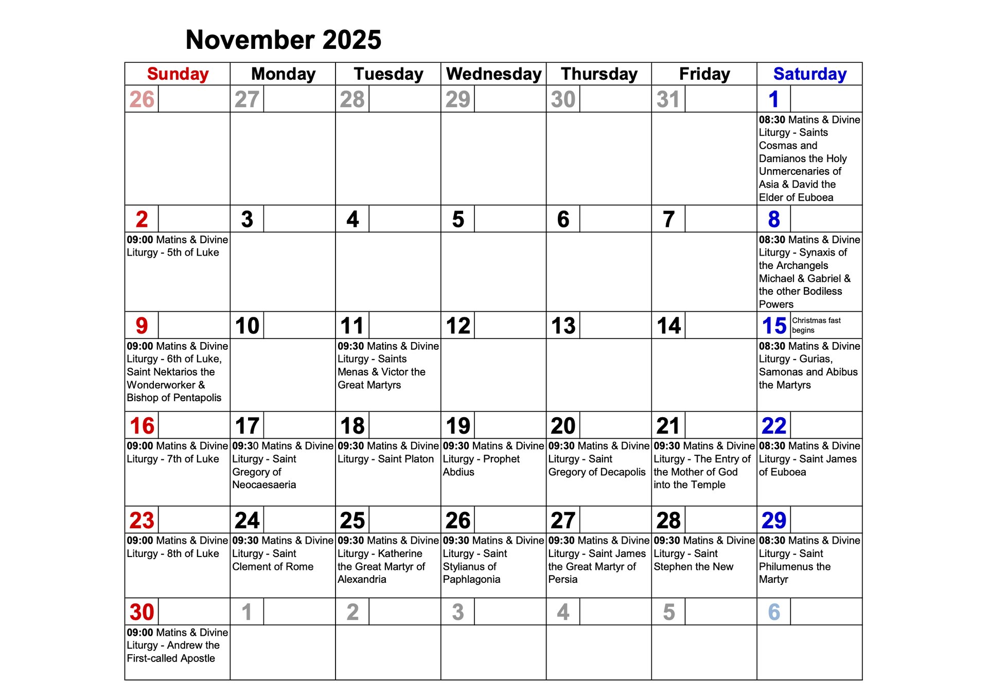 Right below, details on sacraments, services and related activities on offer, all held at Church, unless otherwise specified.